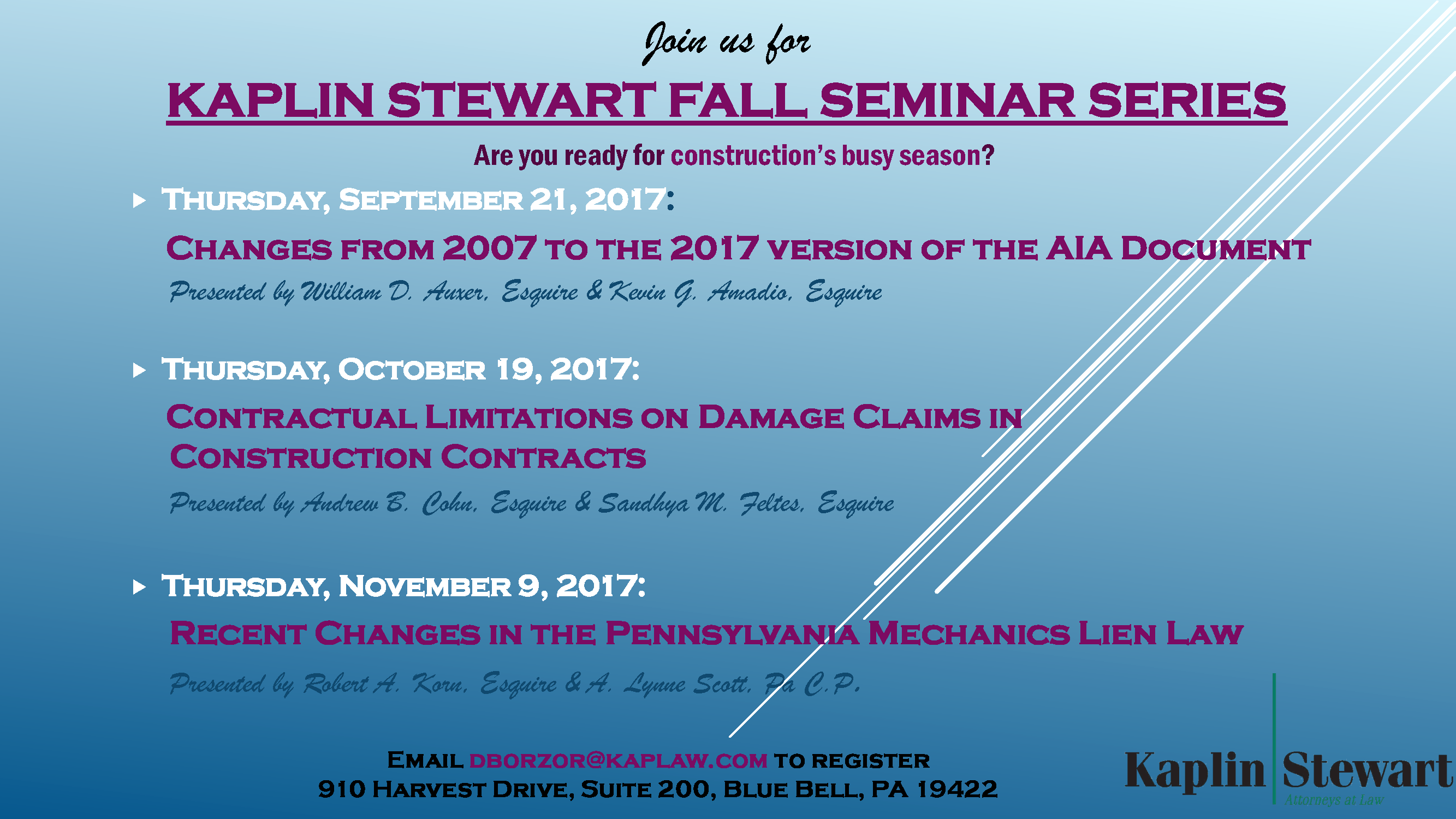 To register contact Danielle Borzor at 610.941.2574 or dborzor@kaplaw.com.